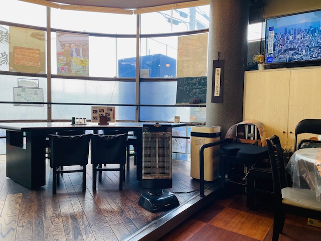 テーブル席もあるぞ。明るい店内じゃ・・・おや、あの黒板は何じゃ?