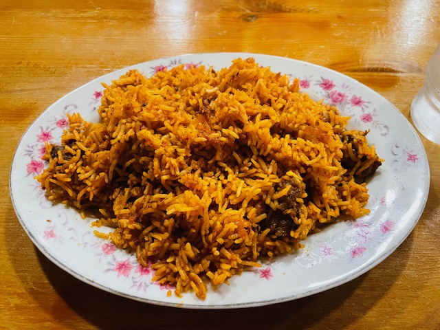 すごいボリュームじゃ!一般的な街中華のチャーハンの倍くらいの量じゃ!マトン(羊肉)もしっかりと入っておるぞ!満腹じゃ!
