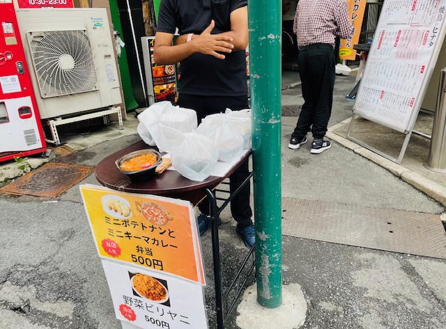 万博ロスの寂しさを胸に抱えながら、富田商店街を彷徨っていると、陽気な店員が、野菜ビリヤニや、ミニポテトナンとミニキーマカレー弁当を500円という破格値で売っておった。万博で金銭感覚がバグっておるわしは目を疑った。
